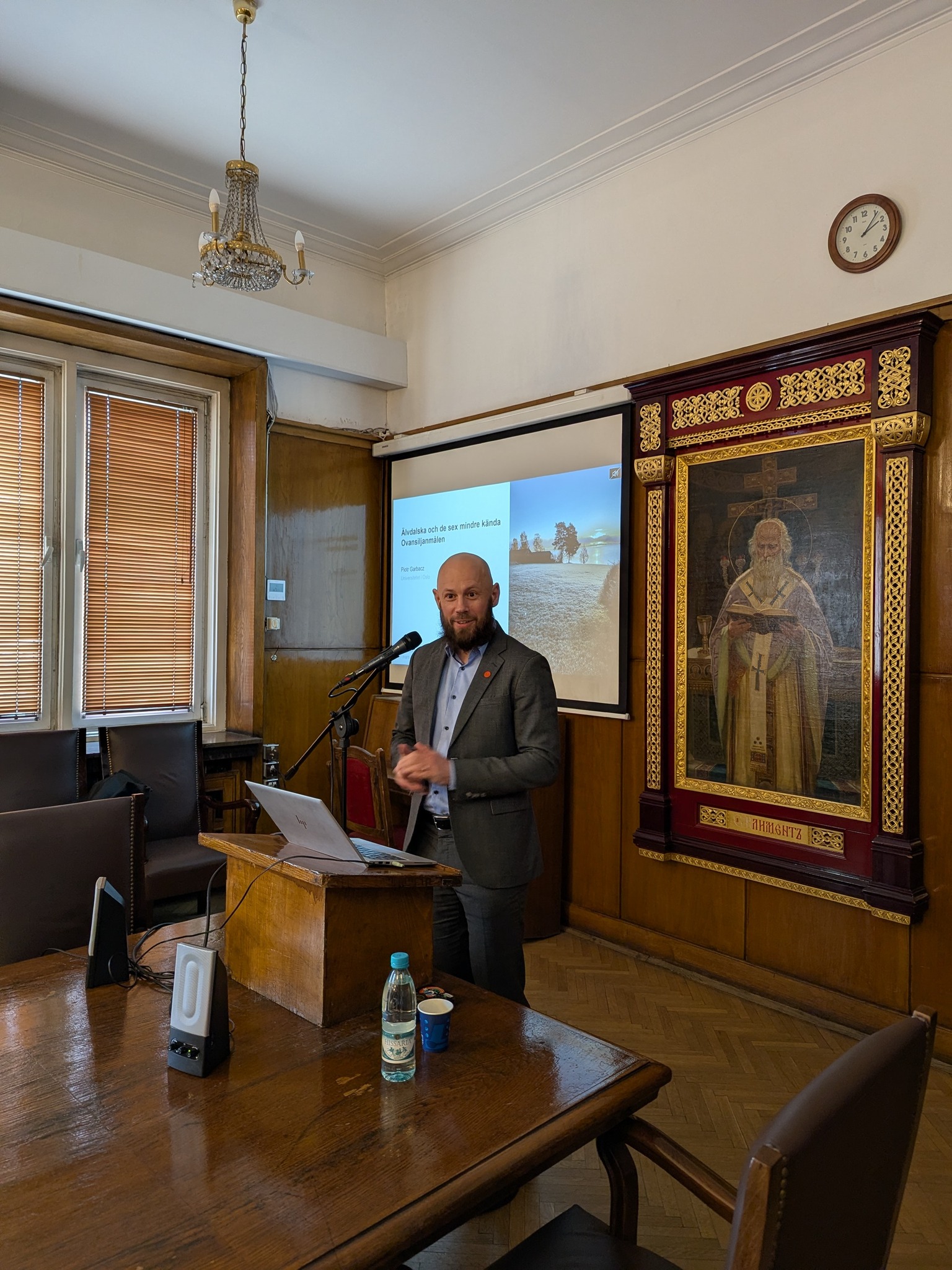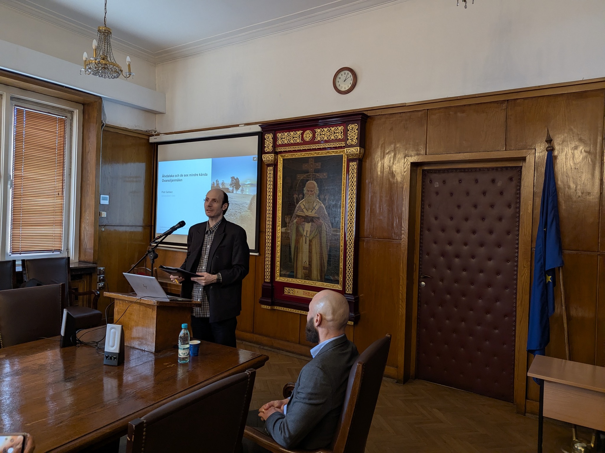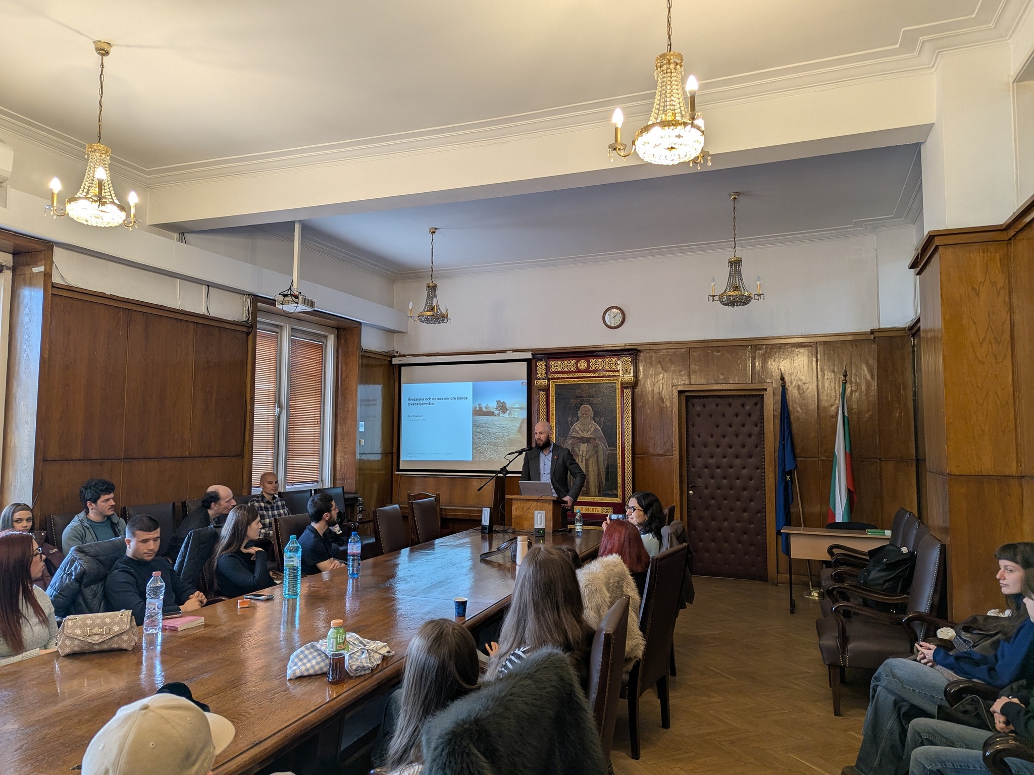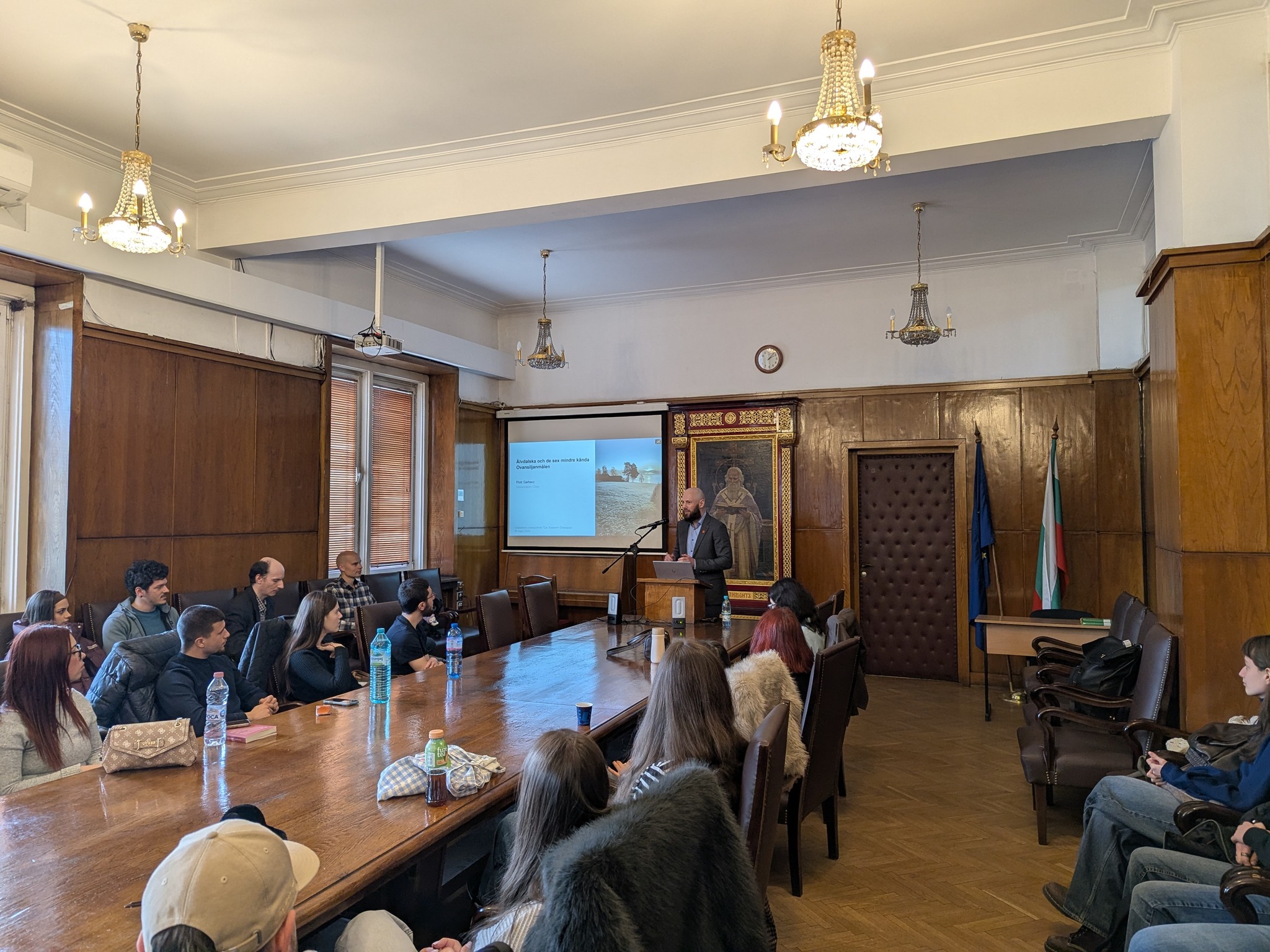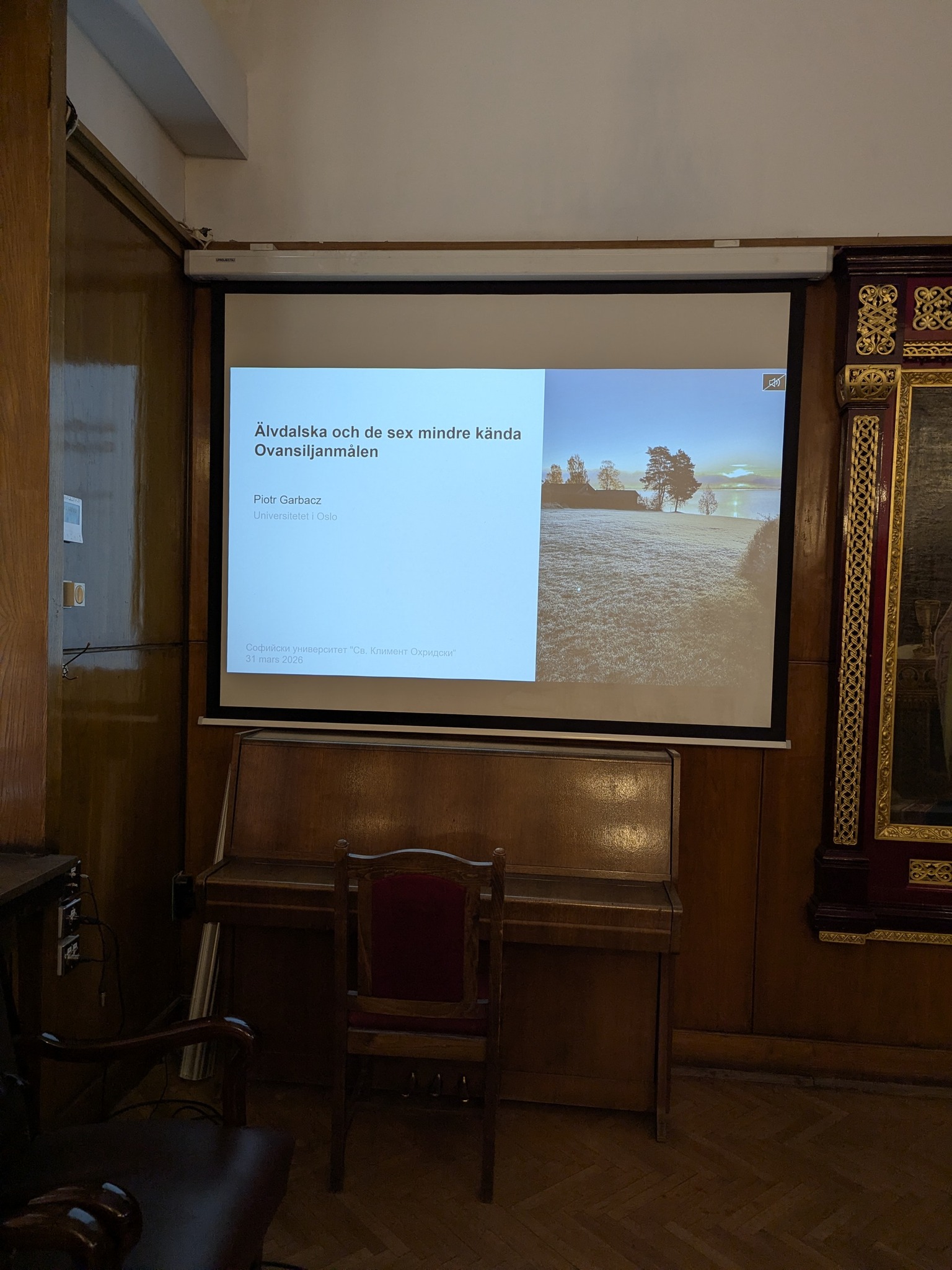 На 31 март от 14 до 18 ч. в зала 1 доц. Пьотър Гарбач от Университета в Осло изнесе лекция и проведе работилница (уъркшоп) на тема „Елвдалски и шестте по-малко известни диалекта на областта Овансилян“. Доц. Гарбач е специалист по синтаксис и морфология на скандинавските езици, диалектология и диахронна лингвистика. Лекцията запозна слушателите с историята на диалектите от Овансилян, броя на носителите им, техните характерни черти, отношението към тях и ревитализацията им. В работилницата студенти и преподаватели имаха възможност да се упражнят в разчитане, транскрипция и превод на звукови и писмени записи на диалекти от Овасилян. Лекцията и посещението на доц. Гарбач бяха организирани от специалност „Скандинавистика“ и Шведския институт.
