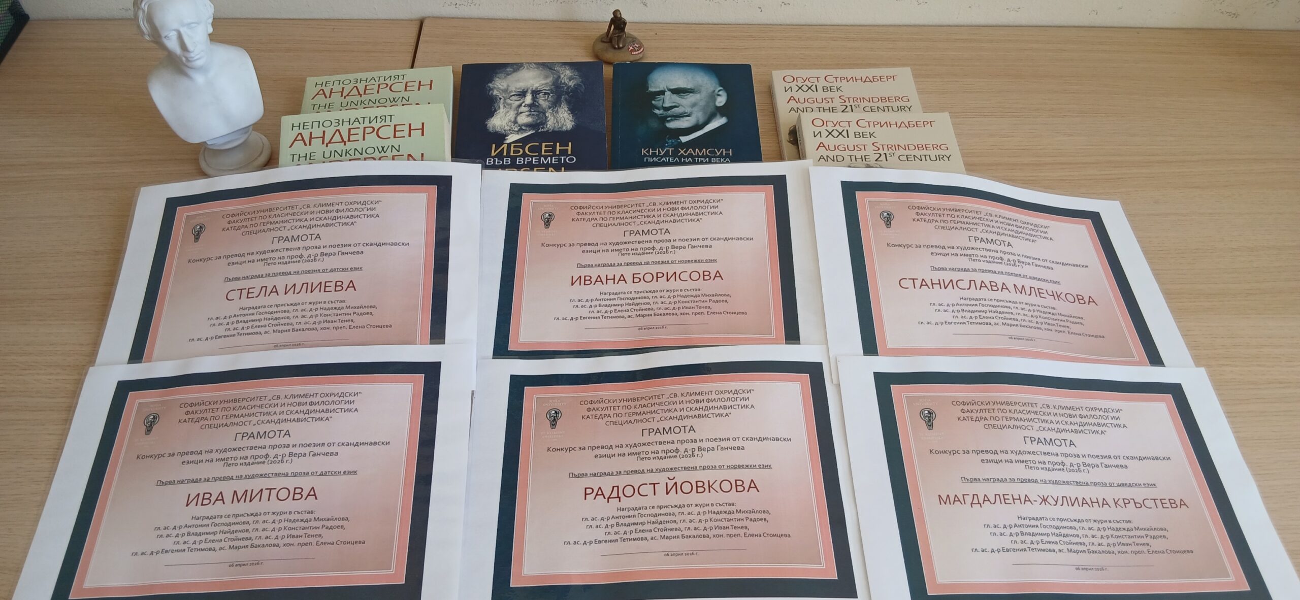 На 06.04.2026 г. в Заседателна зала 1 на Софийския университет „Св. Климент Охридски“ специалност „Скандинавистика“ към катедра „Германистика и скандинавистика“ на Софийския университет „Св. Климент Охридски“ награди победителите в петото издание на конкурса за превод на художествена проза и поезия за студенти и ученици, изучаващи скандинавски езици. Конкурсът e посветен на паметта на проф. д-р Вера Ганчева, изтъкнат скандинавист, преводач, преподавател, издател и учен. В настоящото пето издание се включиха 22 участници с общо 39 превода.